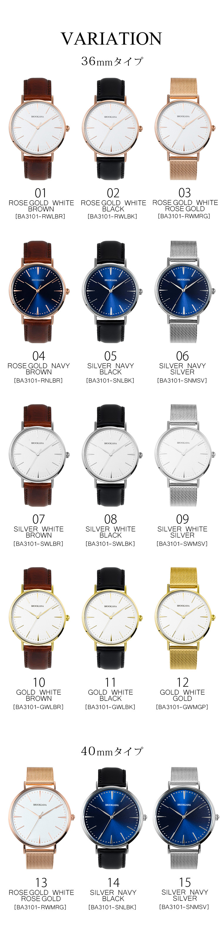 フェイスはユニセックスの36mm(BA3101)と、メンズサイズ40mm(BA3102)